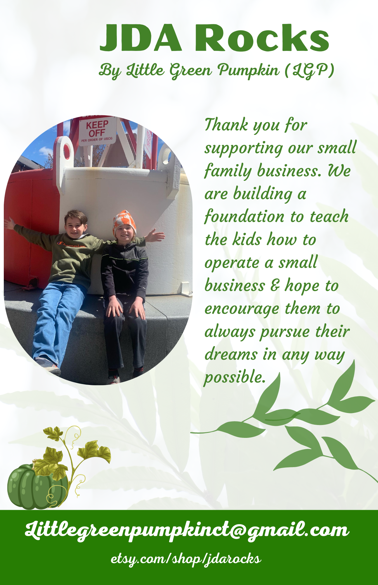 JDA Rocks by Little Green Pumpkin was started by 2 young boys and their love of business. We offer simple pendants, stones sets, and specialty apparel & gift items. We also create our licensed home-made sweets and treats by Austin. Our young entrepreneurs have everything you need to treat yourself and inspire others.